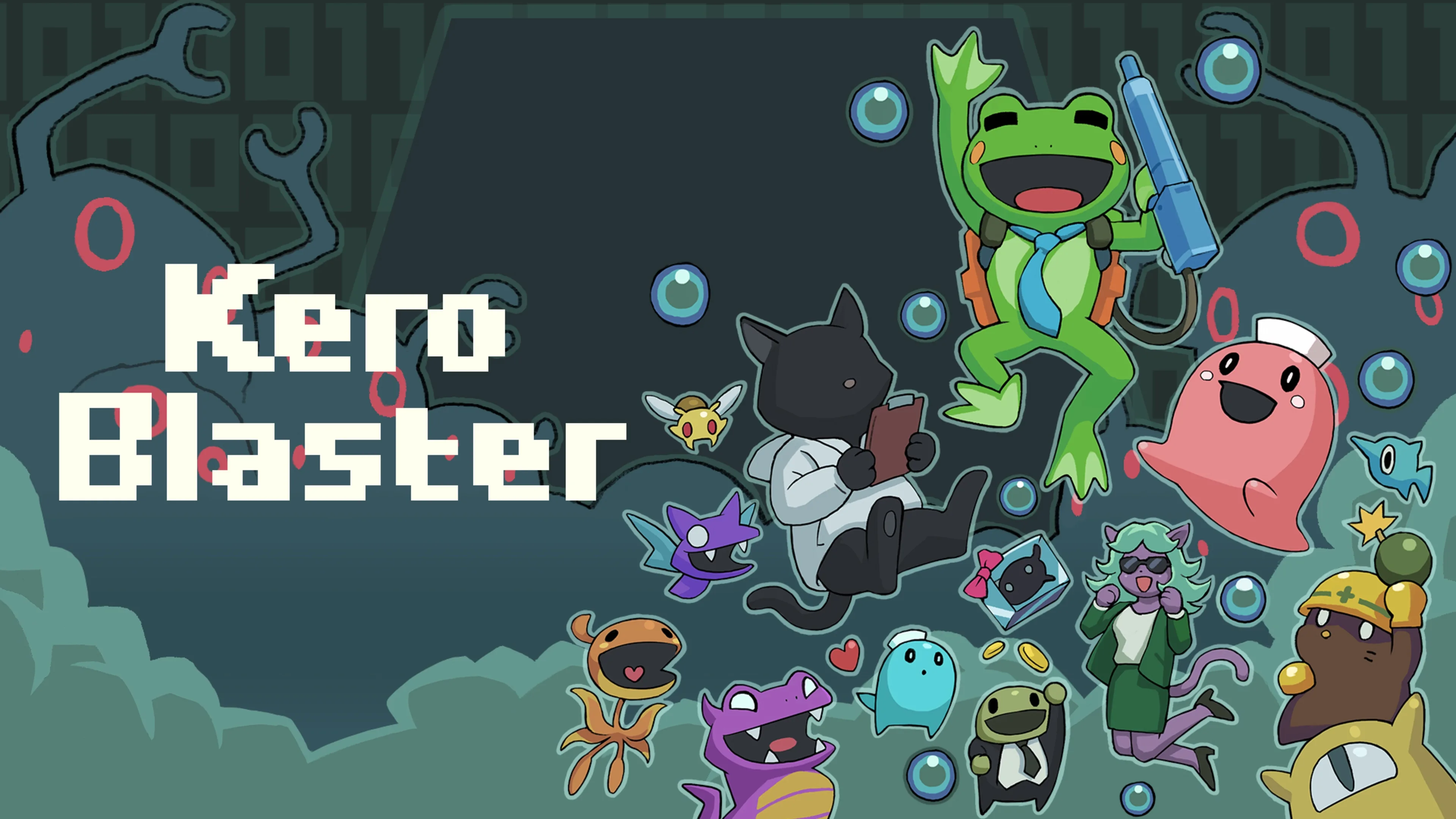 Kero Blaster is a platform video game created by Daisuke "Pixel" Amaya. It was released in 2014 for PC and iOS and is the first major project of Pixel since Cave Story in 2004. The game lays a heavy emphasis on shooting and got positive reviews on both platforms. A short, free demo titled Pink Hour has been available since a month before the full game's release. In Kero Blaster, the player controls a frog working for Cat & Frog, a teleporter company. Armed with a peashooter, he has to clean the teleporters of strange black monsters. The player has to work their way through a series of linear stages, by means of running, gunning and jumping. USGamer described the gameplay as "akin to ... Contra or old-school, pre-Symphony of the Night Castlevanias." Furthermore, the game is controlled by changing direction, jumping, firing your weapon and changing your weapon. Holding down the fire button continues to fire in the direction you were facing when you started shooting.