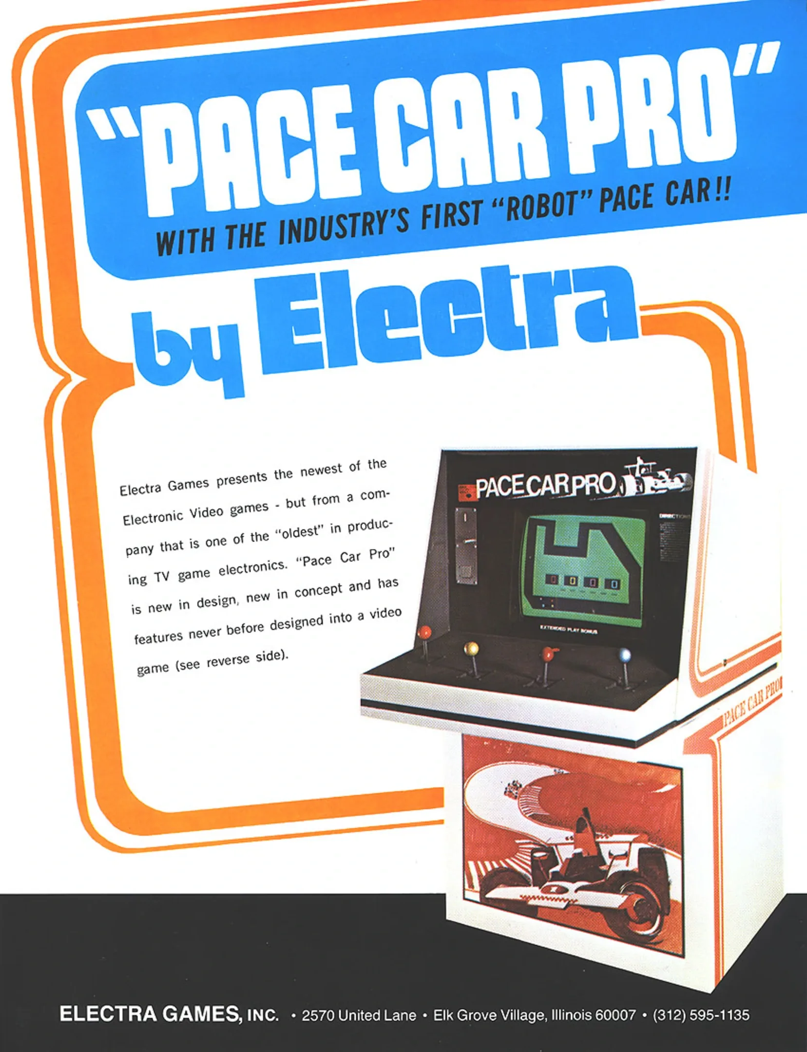 A four-player, high-speed car racing game where each person uses a joystick to control the speed, direction and brakes of his or her car.One of the first games to use a color monitor, an actual color TV set.