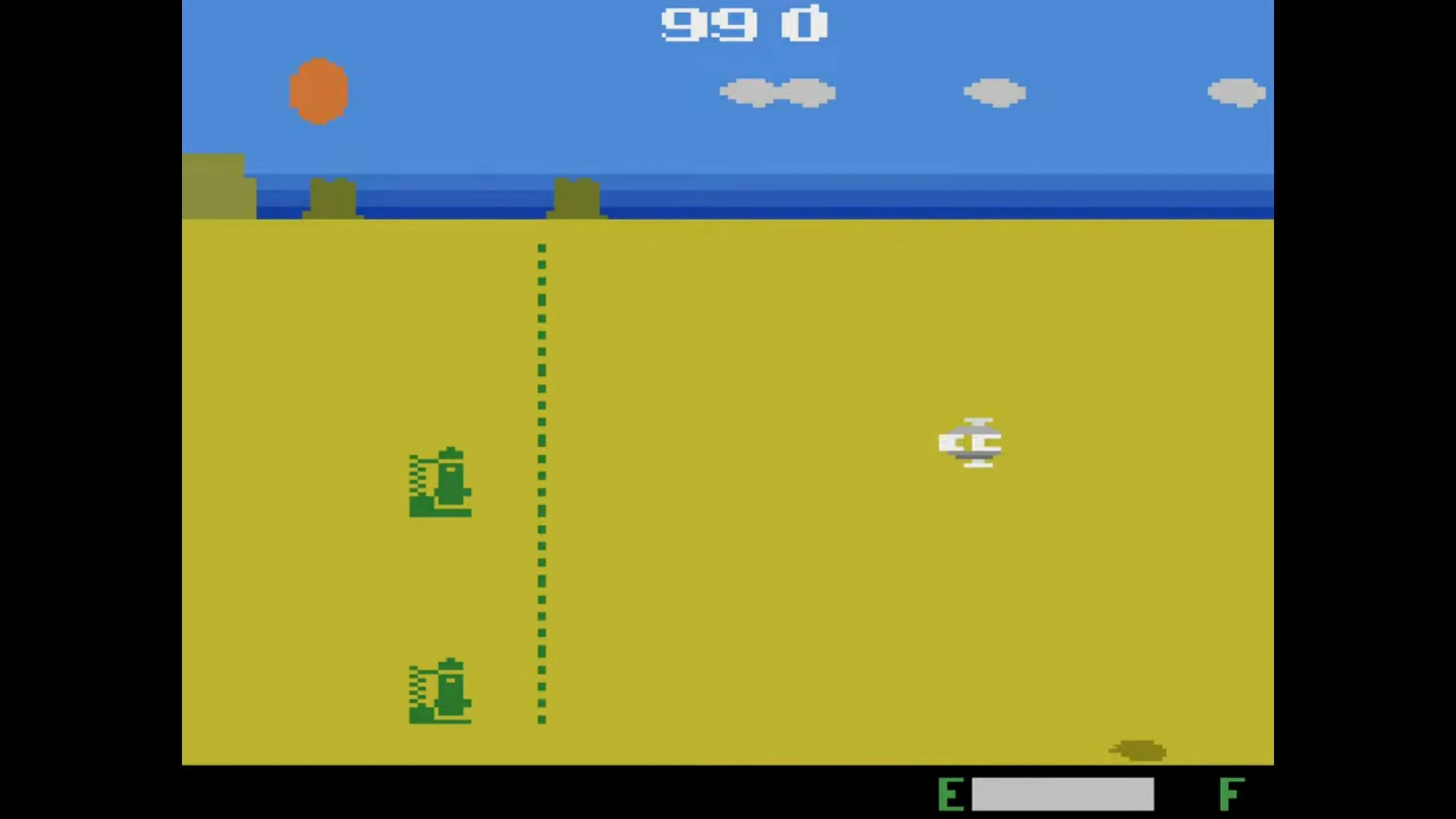 In Planet Patrol it is your misssion to destroy fuel depots of the enemy. You are flying from right to left while dodging oncoming missiles and shooting down enemy ships. In order to replenish your fuel you firstly have to fly into a black ship which will cause a landing strip to appear. After having succesfully landed a truck will refill your ship with fuel. After nightfall enemy ship are not discernable from the background anymore. In order to see them the player has to fire his weapons which makes the enemy ships briefly visible again in the ensuing muzzle flash.