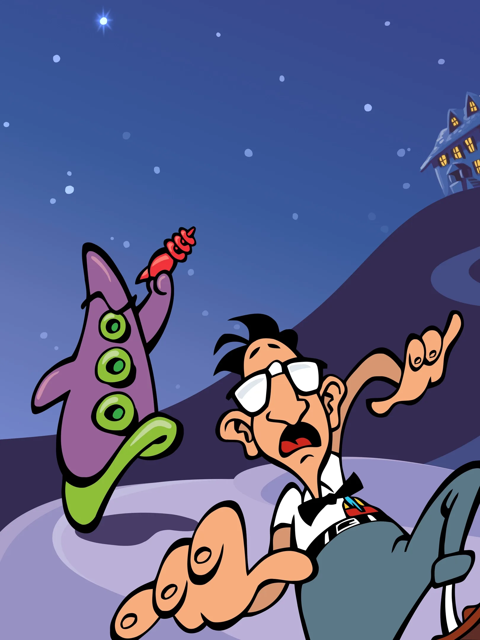 Day of the Tentacle, also known as Maniac Mansion II: Day of the Tentacle, is a 1993 graphic adventure game developed and published by LucasArts. It is the sequel to the 1987 game Maniac Mansion. The game's plot follows Bernard Bernoulli and his friends Hoagie and Laverne as they attempt to stop the evil Purple Tentacle — a sentient, disembodied tentacle — from taking over the world. The player takes control of the three and solves puzzles while using time travel to explore different periods of history. Dave Grossman and Tim Schafer co-led the game's development, their first time in such a role. The pair carried over a limited amount of elements from Maniac Mansion and forwent the character selection aspect to simplify development. Inspirations included Chuck Jones cartoons and the history of the United States. Day of the Tentacle is the eighth LucasArts title to use the SCUMM engine, and the company's first title to feature voice acting. The game was released simultaneously on floppy disk and CD-ROM to critical acclaim and commercial success. Critics focused on its cartoon-style visuals and comedic elements. Day of the Tentacle has featured regularly in lists of "top" games published more than two decades after its release, and aspects have been referenced in popular culture.