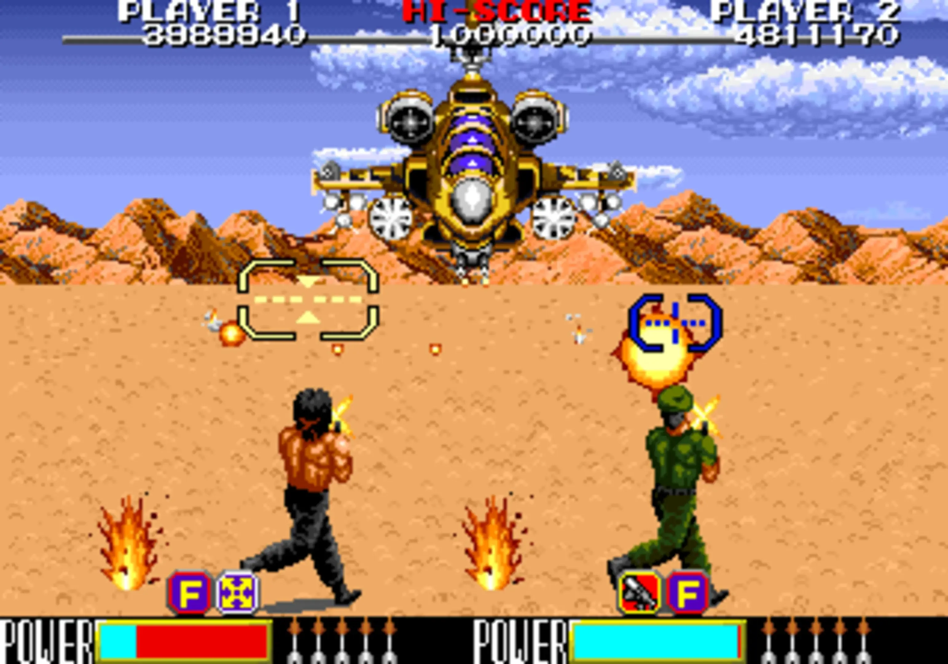 Rambo III for the arcade is a different game compared to the one released for the SEGA consoles and the computer ports. The arcade version was is a rail shooter game played from the third-person perspective whereby Rambo would have to blast through hordes of enemy soldiers, jets, tanks using various weapons with crosshairs, as well as fight tank bosses at the end of each level.