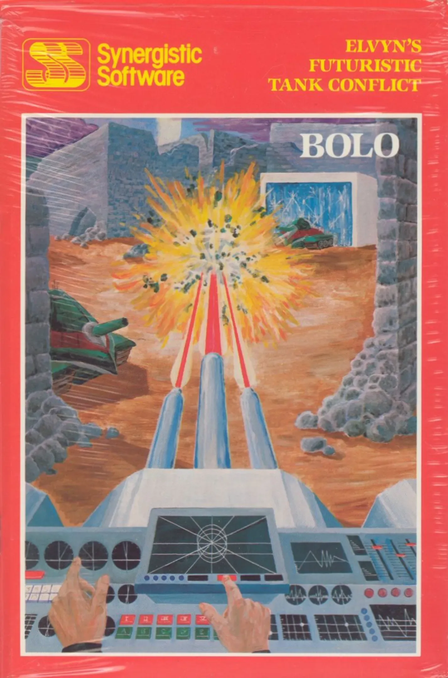 Upon startup Bolo requests a level number (1–9) and density (1–5); the game then generates a random rectangular maze containing six enemy bases. The higher the density specified, the more walls appear in the maze. The player controls a tank, and must destroy the six enemy bases to advance to the next level. The player can view 1/132 of the maze at one time; indicators on the right side of the screen show the player's position within the maze, the direction of the enemy bases and the fuel remaining. Enemy tanks constantly emerge from each of the six enemy bases. Different levels feature different types of enemy tanks; some move randomly while others pursue the player. All enemy tanks fire deadly shells. If the player collides with a bullet, an enemy base or tank, or a wall, a turn is lost. A turn is also lost if the player runs out of fuel; destroying an enemy base will replenish the player's fuel supply. The player is provided with four tanks per game, and no opportunity is provided to earn more.
