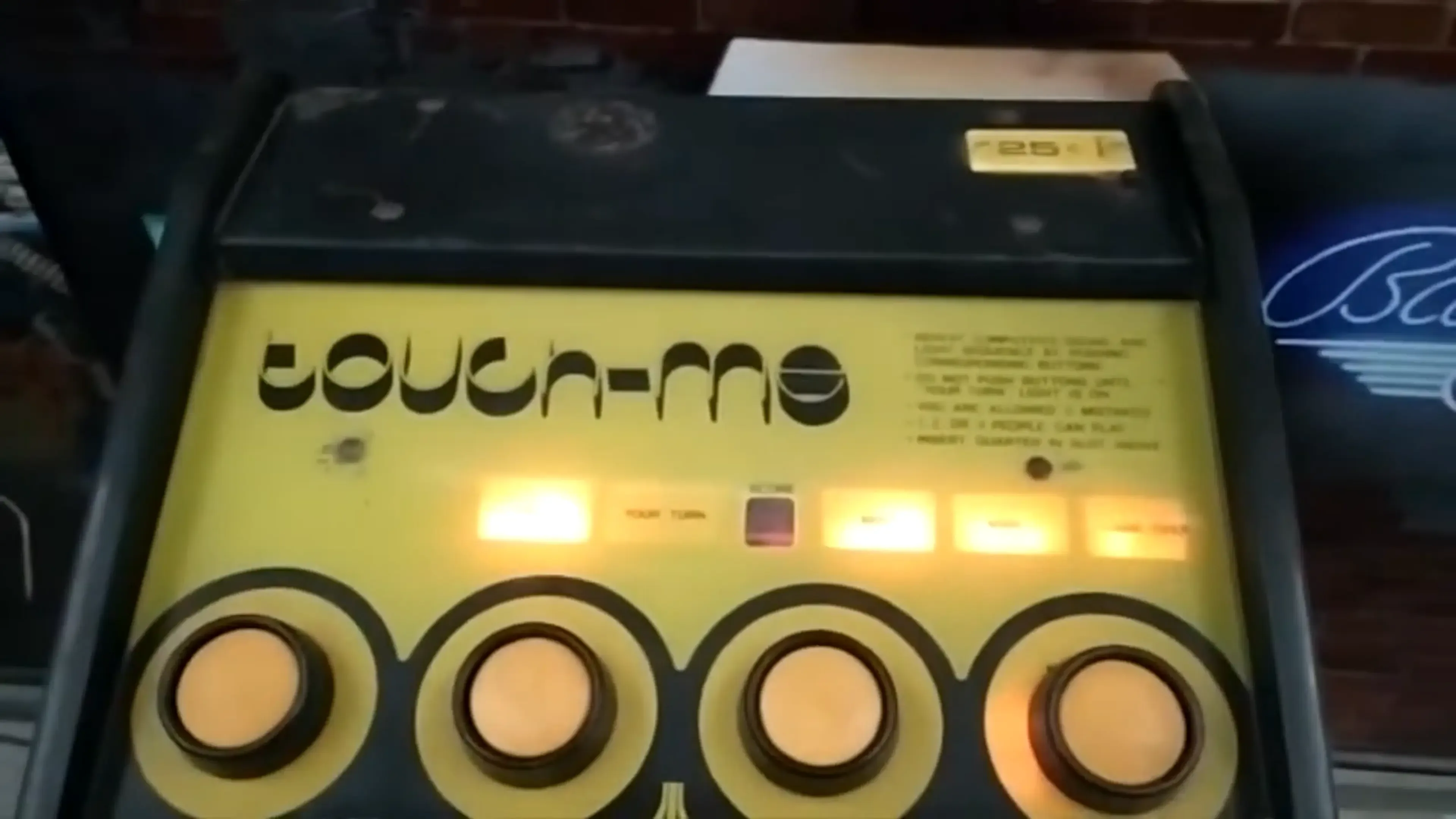 Touch me challenges the player to remember the sequence of sight and sound, and correctly repeat the pattern. The drop of the quarter in the top-mounted acceptor activates the computer to present a single-tone sound. When the sound occurs, the corresponding button lights to give a visual clue. Then the game pauses long enough for the player to "confirm" the sound to the computer by pressing the same button that lit. Oops! Wrong button? ERROR number one… and a lighted window tells the player he's goofed. Then another chance… the sound and lighted button are repeated by the computer. Another pause … right! You've hit the right button(s) in the right sequence, and the game goes on to another sound sequence. Every correct player response adds an additional sound/note to the sequence. "Beep – beep – bloop – beep – bloop" … Did you correctly repeat those sounds when the buttons lit? Sorry, only three errors per game. You'll have to insert another 25¢ and try again!