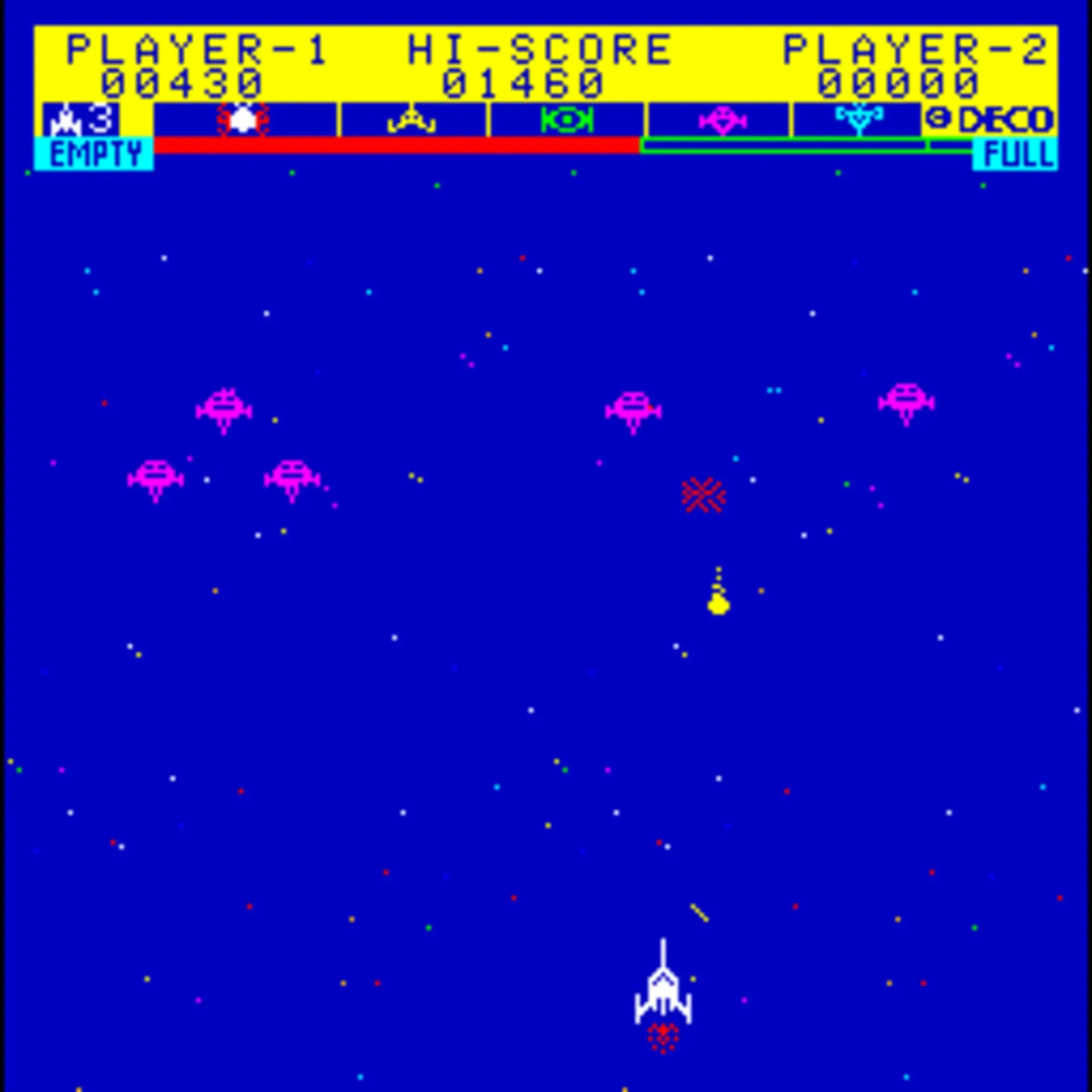 The game of Astro Fighter consists of 4 waves and a refueling stage, which are then repeated with increasingly higher difficulty. The player's task is to eliminate the four successive waves of different types of attacking craft, while avoiding being hit by missiles and bombs, and then refuel by shooting the 'GS' ship before repeating the process. The player starts with 3 lives and receives a bonus life on reaching a score of 5000. 300 bonus points are received for shooting each 6 falling bombs and for 950 for hitting the GS ship accurately on the first shot. A very large bonus of 10,000 is given for getting through 4 waves and refueling by using exactly 2 shots more than the minimum needed. As the higher levels of Astro Fighter are difficult to survive consistently, even for the best players, the highest scores have been achieved by the achieving the 10,000 bonus deliberately.