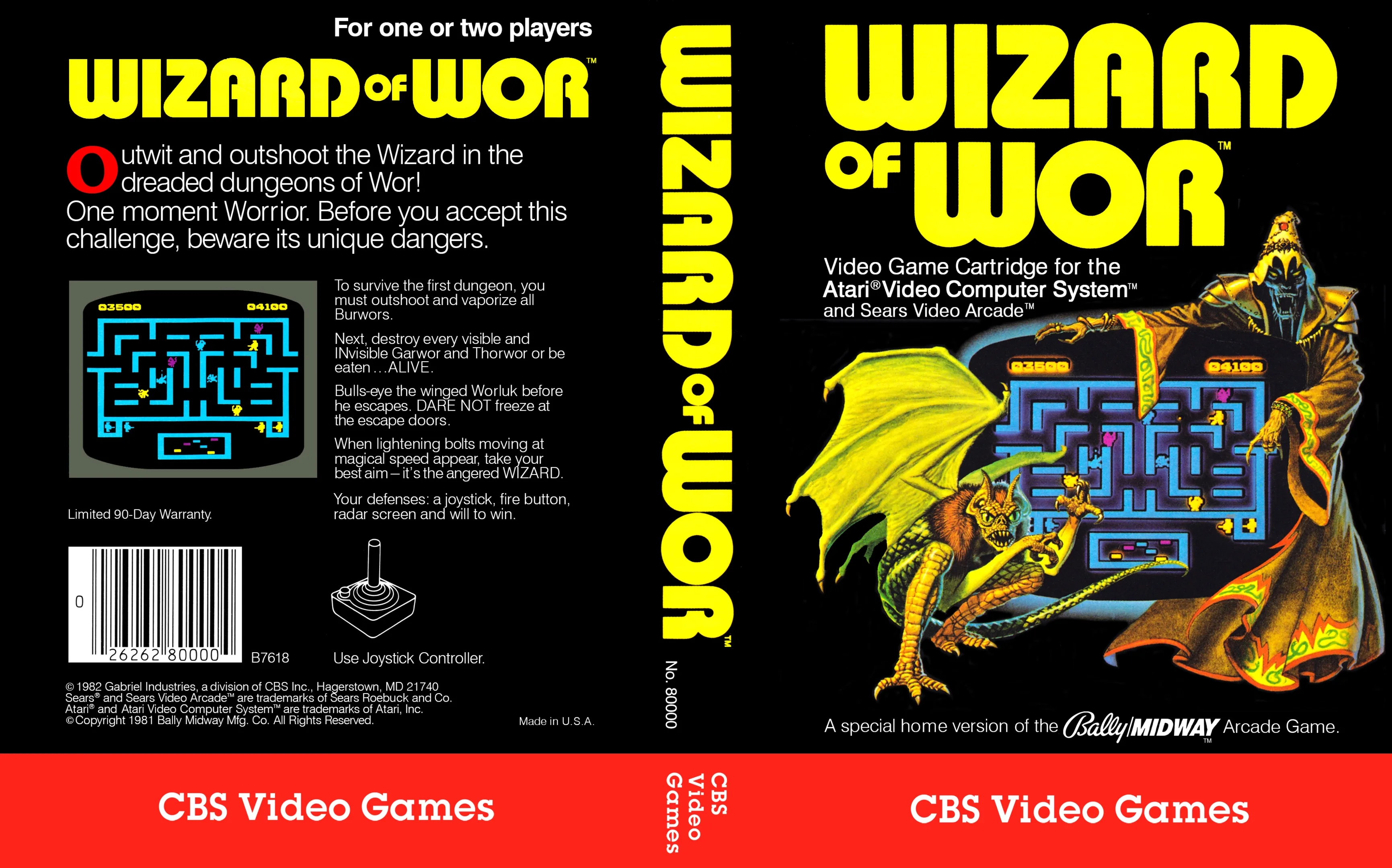 Wizard of Wor is an arcade shooter played from a top-down point of view. The player controls a warrior who is trapped in a dungeon. The goal is to earn as many points as possible by shooting the numerous enemy creatures which wander about the maze like corridors. The creatures wander about at various speeds, may shoot darts at the player, and some even have the ability to disappear temporarily. At the bottom of the screen the player has a radar which can be used to locate creatures that are invisible. When the the player completes a maze, a Worluk sometimes appears. This creature moves rapidly and will only be on the screen momentarily. If the player destroys the creature before it escapes, the next dungeon will become a double score dungeon and all creatures will be worth twice as many points. Occasionally the Wizard of Wor himself may appear! He moves quickly and can teleport around the maze. If they destroy him, the player will earn a large amount of points. The game may be played by one player or two players simultaneously.