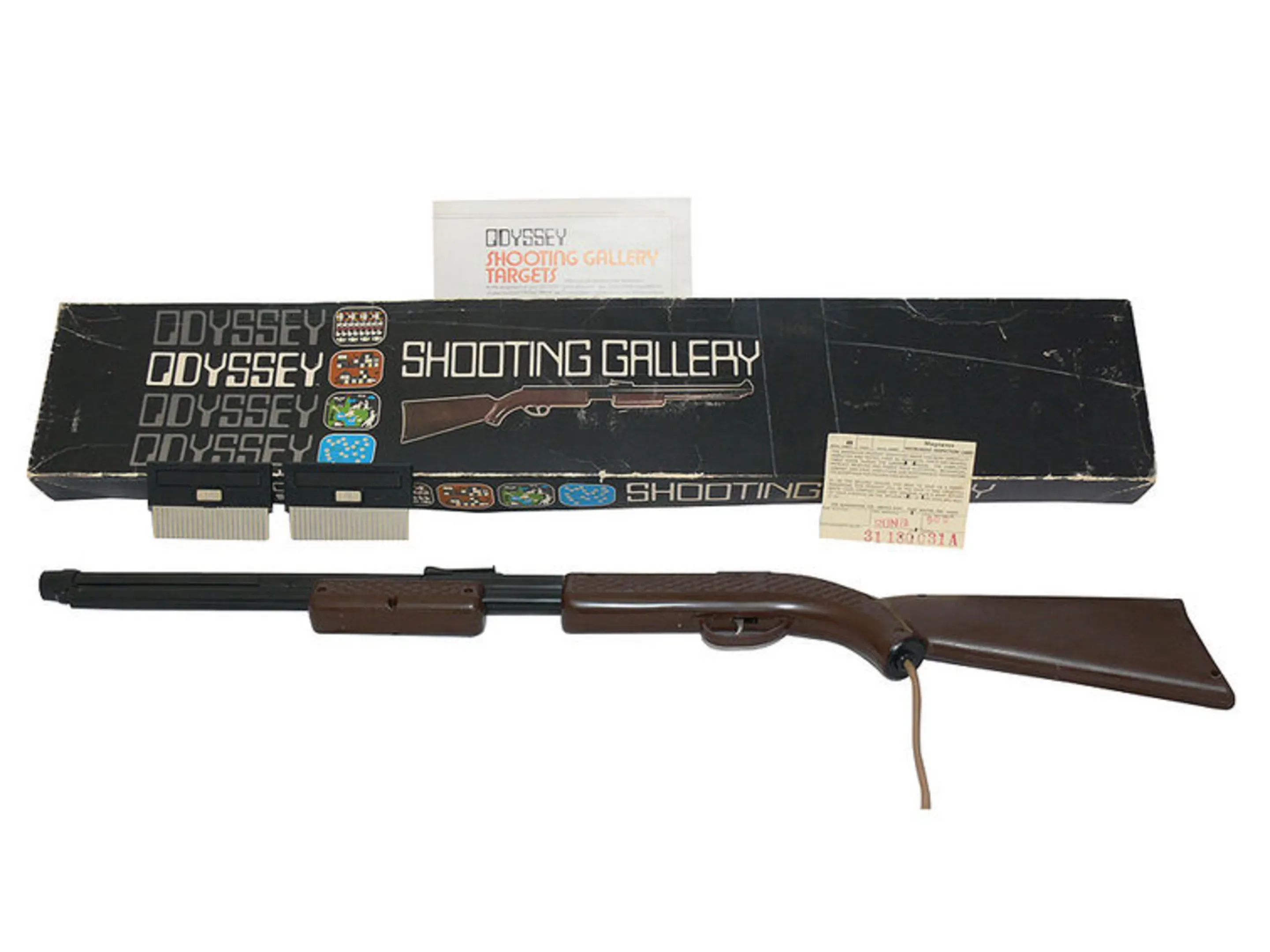 Shooting Gallery was the very first collection of shooting games with a light gun for a home console system. It came on the Magnavox Odyssey Cartrdige No. 10, used a original sized rifle and four different screen overlays.