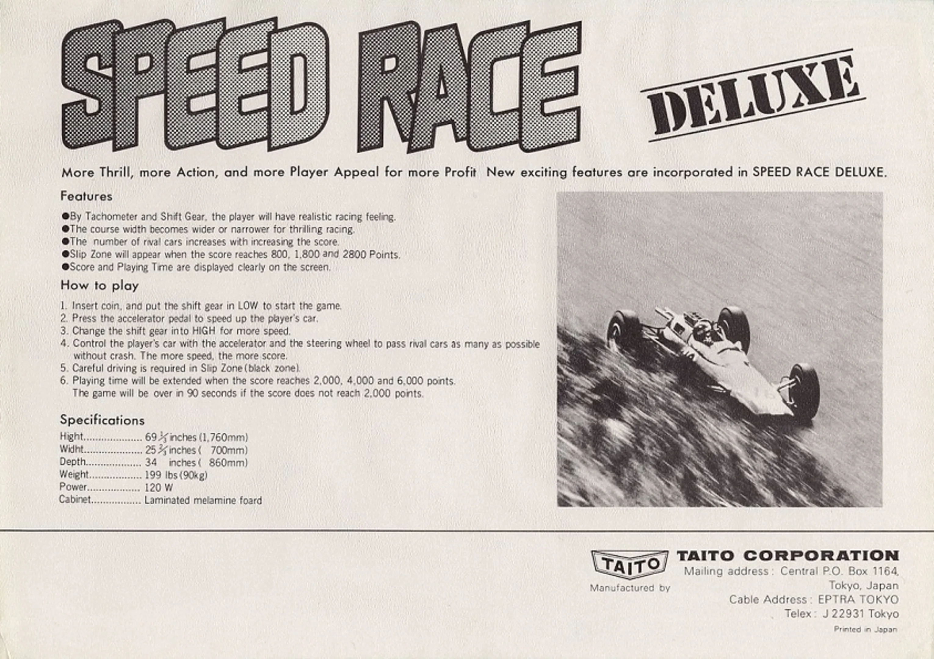 The original Speed Race and Wheels had an upright arcade cabinet, while Midway's Racer introduced a sit-down cabinet. Taito released an updated version of Speed Race called Speed Race DX in 1975. Speed Race DX is an updated version of Speed Race. The game plays mostly identical, with the player racing in a top-down view and gaining points for overtaking other cars. The cabinet is bigger and two new features have been added to the game with a gear shift lever and an in-game timer.