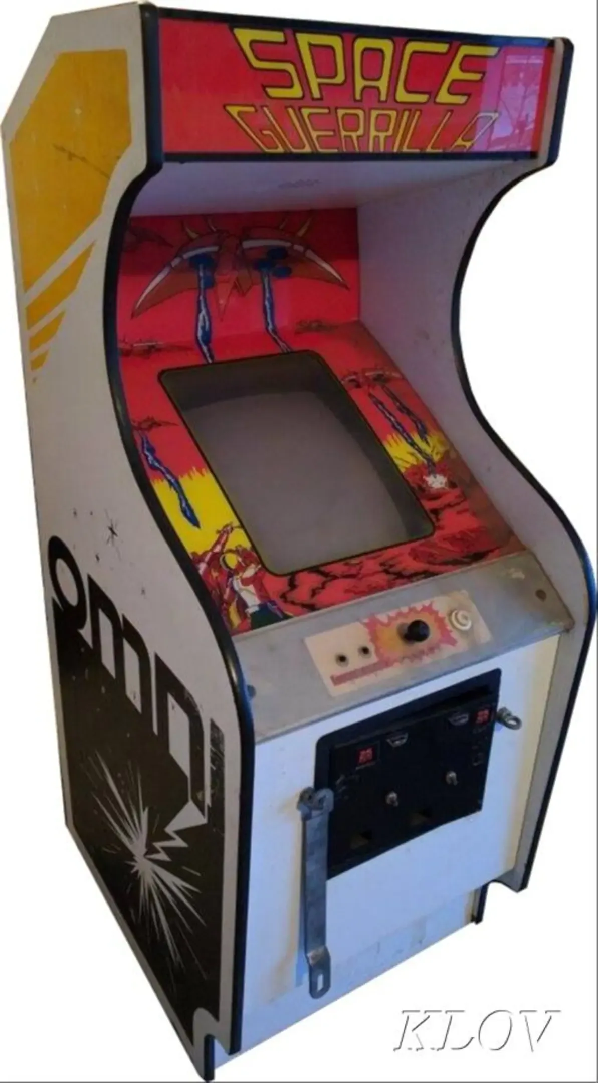 Space Guerrilla is a fixed-screen shooter in the vein of Space Invaders but with some interesting twists. The player controls their tank at the bottom of the screen and must prevent an alien invasion. Instead of the typical four bunkers, there are three pieces of scenery with buildings. The attract screen starts with a little animation of aliens landing on one of them and peeing. Another difference with the typical Space Invaders clone is that while the ships fly in a block formation, they don't go back and forth between the screen boundaries. Instead they fly past and go out of view again, before flying back. Some ships also dive down towards the bottom of the screen like in Galaxian. When the player loses all their lives the game is lost.