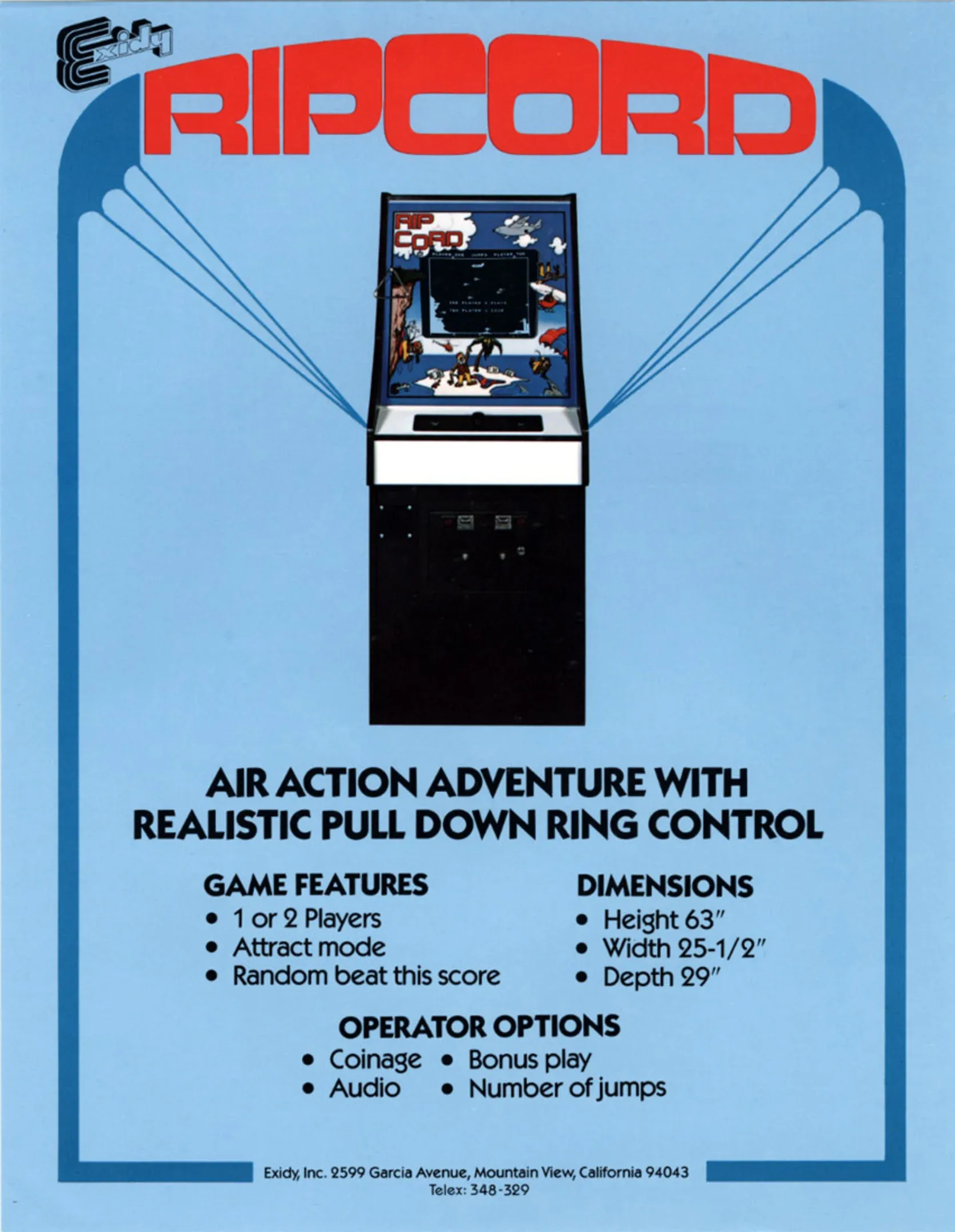 Rip Cord was another black & white game released by Exidy in 1979. It was designed and programmed by Arlan Granger. The goal of the game is to jump out of the plane and land safely on one of the many targets down below. The challenge is to avoid the numerous enemy helicopters that occupy the sky in between your plane and the ground. You control the timing of your jump with the Jump button, at which point your parachutist begins hurtling toward the ground out of control. Pressing the D-Ring button shortly afterwards releases the chute and slows your descent. More importantly, it allows you at this point to control your left/right position via the paddle control to help you avoid the enemies.