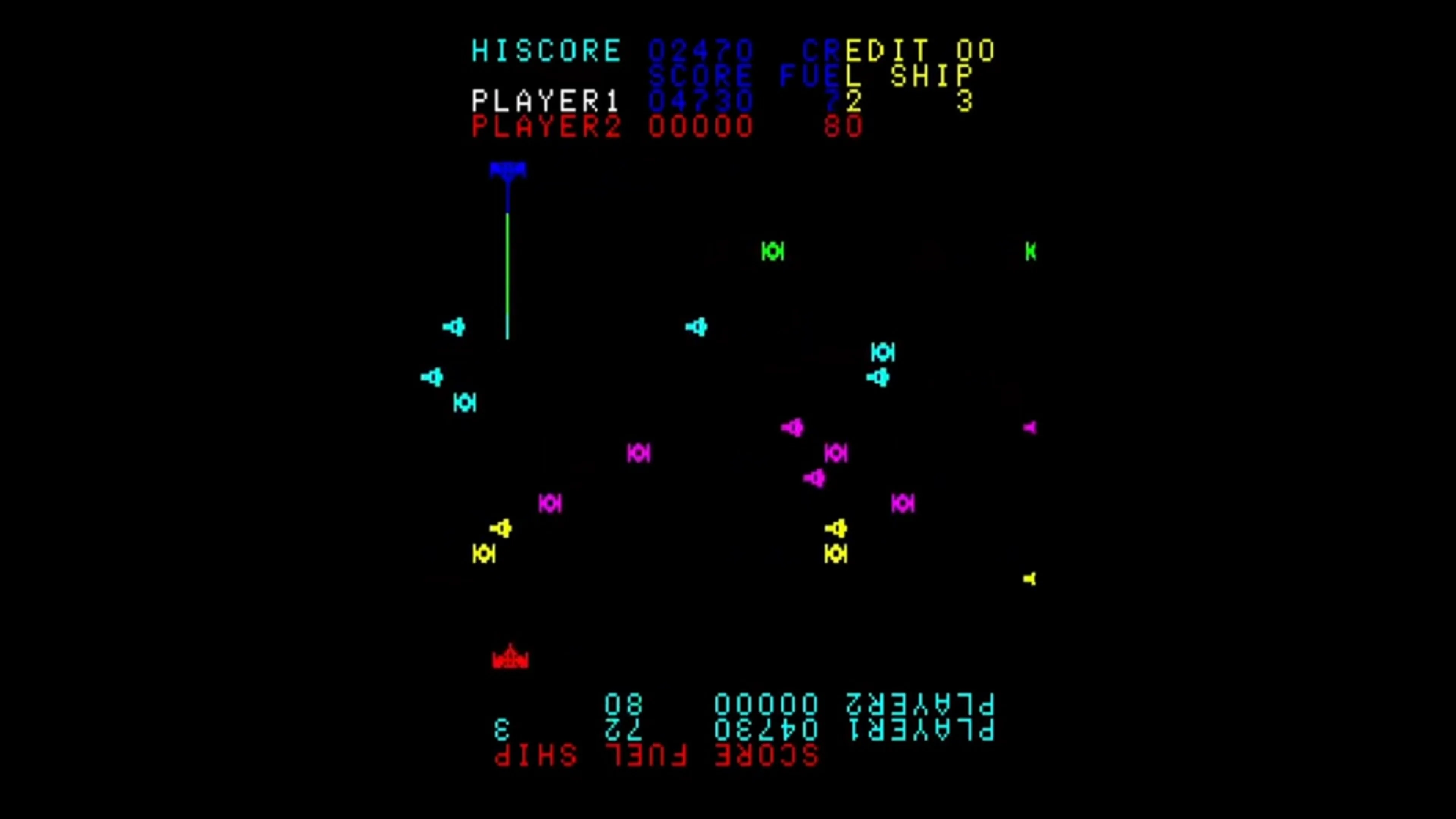 Intruder is an arcade game originally released by Konami as Space War. It is a one-on-one spaceship combat game with each player controlling a ship at the top or bottom of the screen. Between the players is a stream of innocent space ship traffic limiting the possibility of getting a clean shot. When your fuel reaches a high number (like 75 or so) your laser will reach the other side of the screen to get your opponent. Once you fire your laser your fuel drops sharply and you must wait for it to build before you can shoot at your opponent again. Space War is Konami's first known original video game design. It was licensed by Taito, who released it as Space Laser (in Europe), and by Game Plan, who released it as Intruder (in North America).