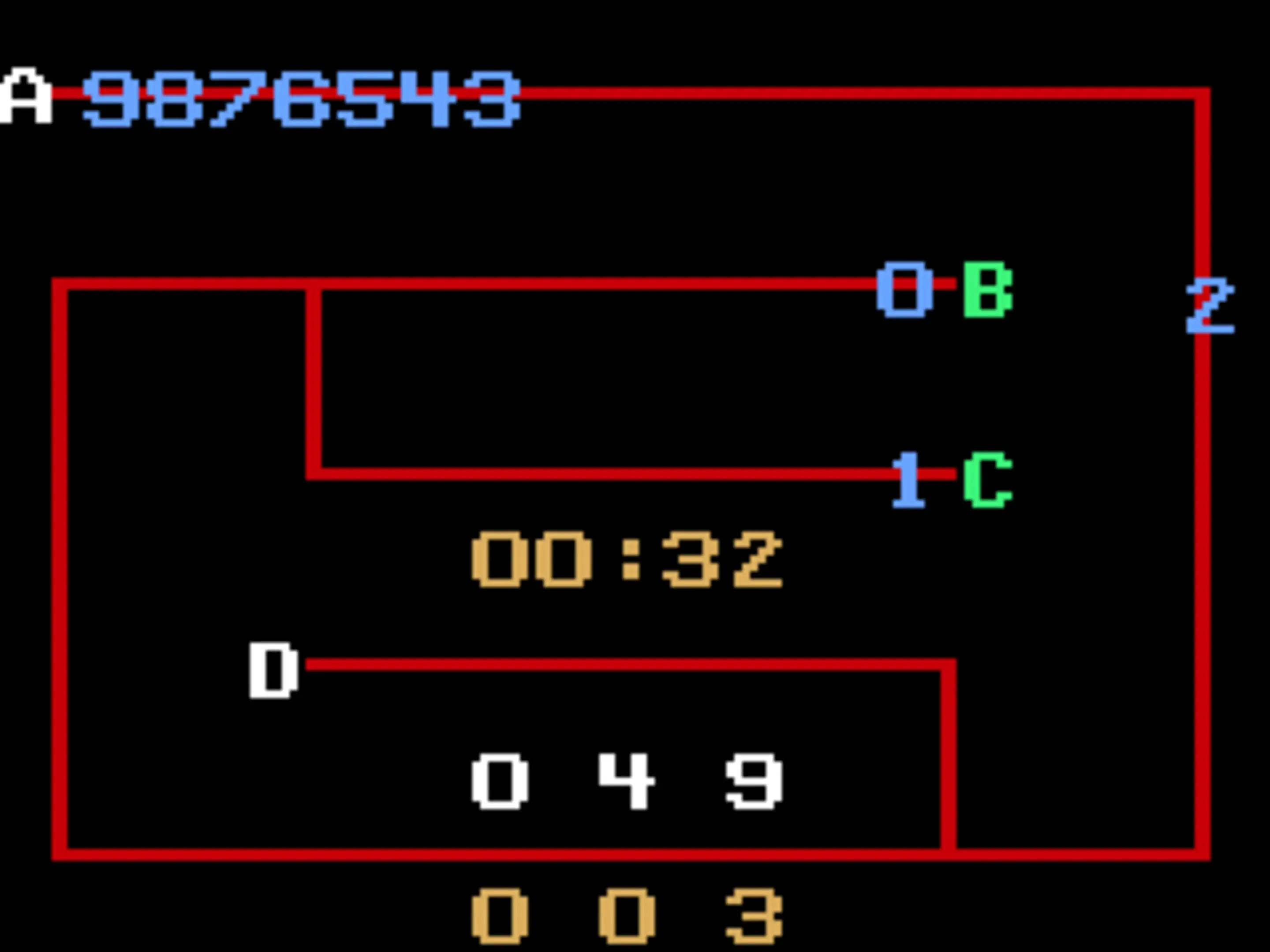 The player has to move a sequence of numbers (9 to 0) from the point A of a pattern of lines to point D (or B in the variations). The numbers must be placed in point D in the same descending order. There are two other points to which the numbers can be moved, B and C. If one or more numbers are parked in one of the points, the player can only additionally move to that point numbers which are lower than the last one already parked. The numbers can be moved one by one only and to do so the player has to type the letter of origin and then type the destiny letter. Moves can be undone by pressing the "clear" key. The computer keeps track of the time elapsed and the number of moves made by the player, also showing the minimum amount of moves to solve the puzzle. There are 9 other possible variations, with the difference of having the way to point D blocked and different amounts of numbers to move. Those variations can be selected by pressing "reset" and the desired number, as follows: one figure - minimum number of moves: 1 two figures - minimum number of moves: 3 three figures - minimum number of moves: 7 four figures - minimum number of moves: 15 five figures - minimum number of moves: 31 six figures - minimum number of moves: 63 seven figures - minimum number of moves: 127 eight figures - minimum number of moves: 255 nine figures - minimum number of moves: 511