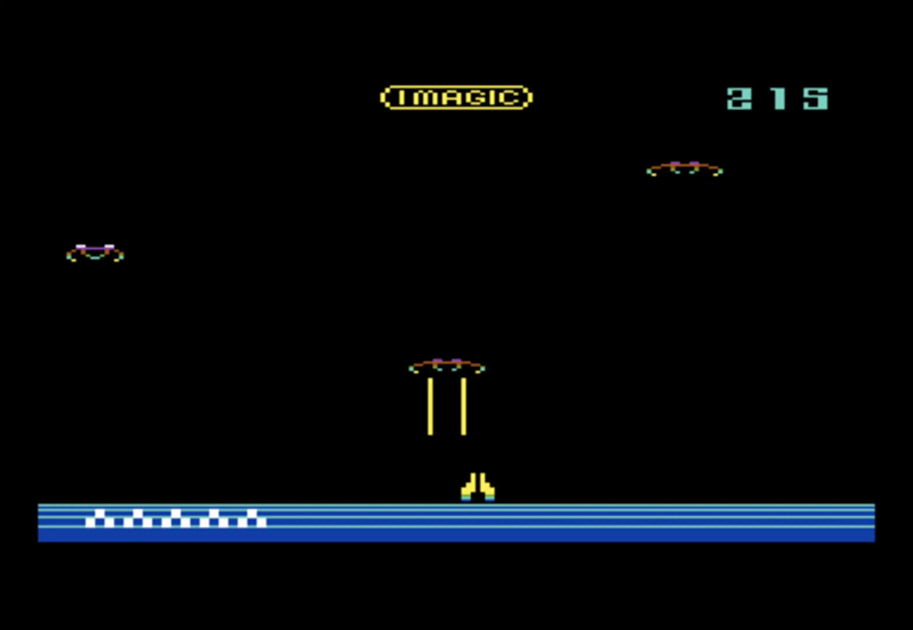 Demon Attack is an arcade action game with gameplay similar to Space Invaders. You control a laser cannon at the bottom of the screen, and need to destroy wave after wave of brightly colored demons. The demons bounce around the screen in bizarre patterns, and try to destroy your cannon with bombs or lasers. When you shoot a demon, it will be replaced with another or will split into two smaller demons depending on which wave you are playing. When the required number of demons for the current round is finally destroyed, you can move on to the next, more difficult round.