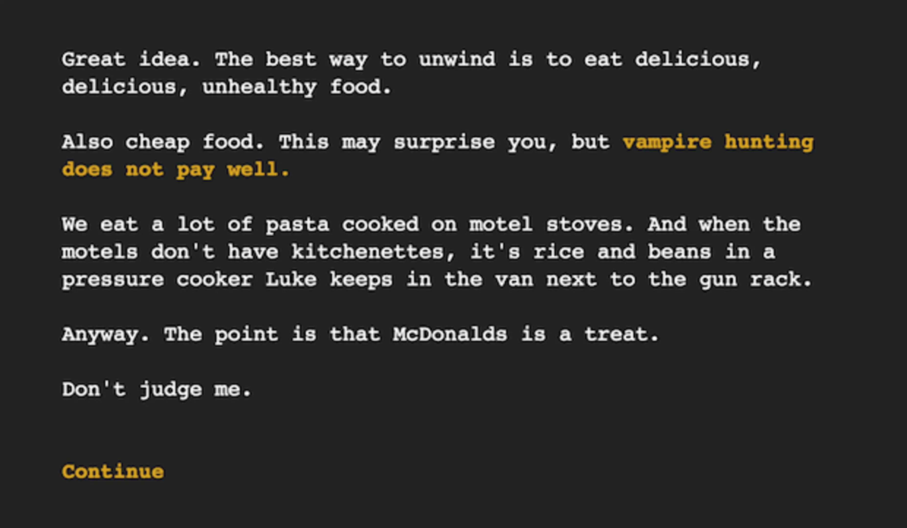 You're a vampire hunter on your night off. You're getting a manicure, seeing a movie, and eating fast food. But there's a vampire in this McDonalds. If you don't do something, then in one hour it will eat the cashier.