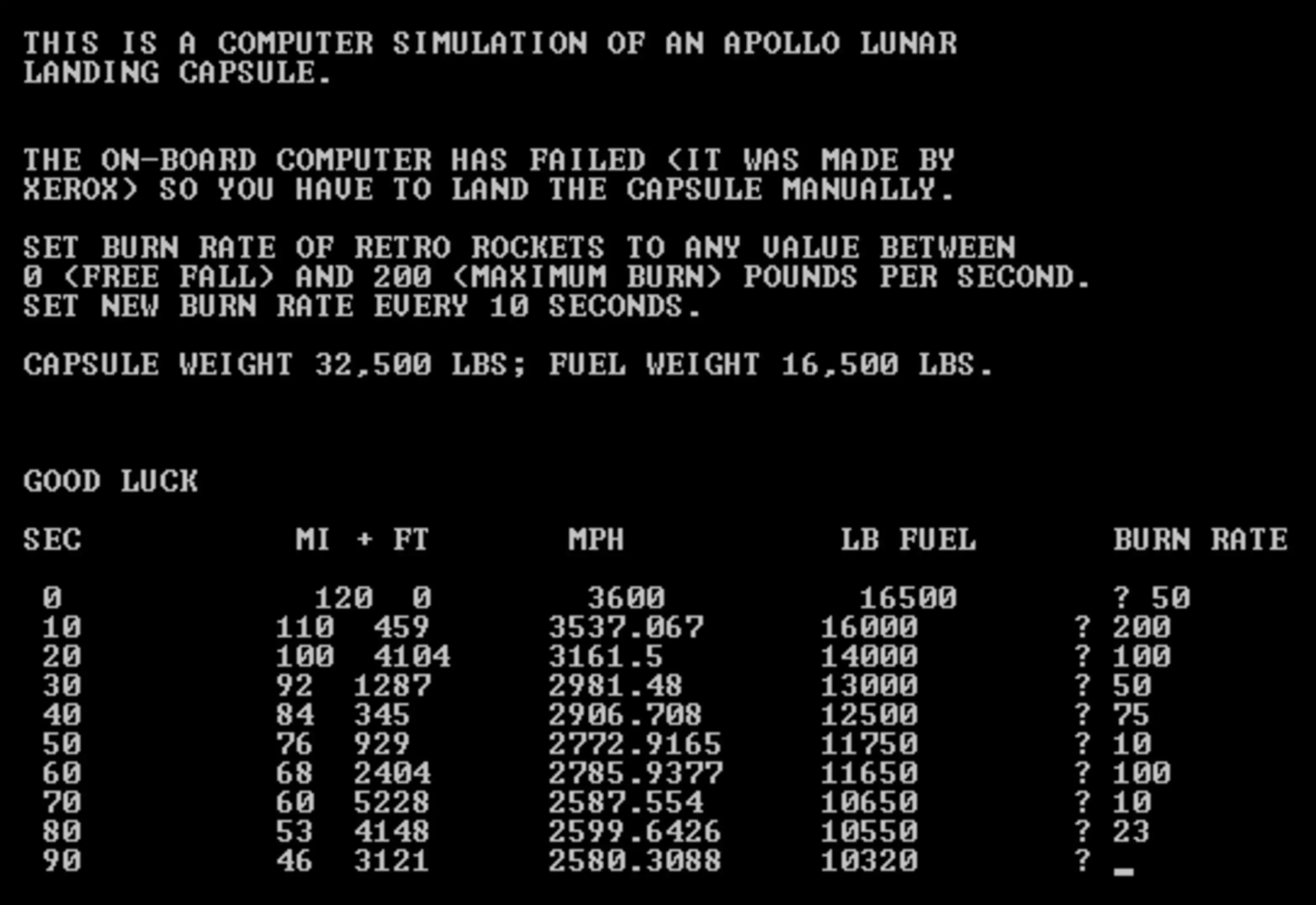The original Lunar Lander game was a 1969 text-based game called Lunar, or alternately the Lunar Landing Game. Lunar Lander was originally written as a text-based computer game in the FOCAL programming language for the Digital Equipment Corporation (DEC) PDP-8 computer by Jim Storer while a student at Lexington High School (Massachusetts) in the autumn of 1969. Storer submitted the game to the DEC users' newsletter, which distributed the source code to readers. Other versions of the concept were written soon after: a version called Rocket was written in BASIC by Eric Peters at DEC, and a third version, LEM, was written by William Labaree II in BASIC, among others. A full game of Rocket, one of the early versions of the game type. The player has only spent fuel at the last moment, and as a result has crashed into the moon. All three text-based games require the player to control a rocket attempting to land on the moon by entering instructions to the rocket in a turn-based system in response to the textual summary of its current position and velocity relative to the ground. In the original Lunar, players controlled only the amount of vertical thrust to apply, based on their current vertical velocity and remaining fuel, with each round representing one second of travel time. Rocket added a simple text-based graphical display of the distance from the ground in each round, while LEM added horizontal velocity and the ability to apply thrust at an angle. In 1970 and 1971, DEC employee and editor of the newsletter David H. Ahl converted two early mainframe games, Lunar and Hamurabi, from the FOCAL language to BASIC, partially as a demonstration of the language on the DEC PDP-8 minicomputer. Their popularity led him to start printing BASIC games in the DEC newsletter, both his own and reader submissions.