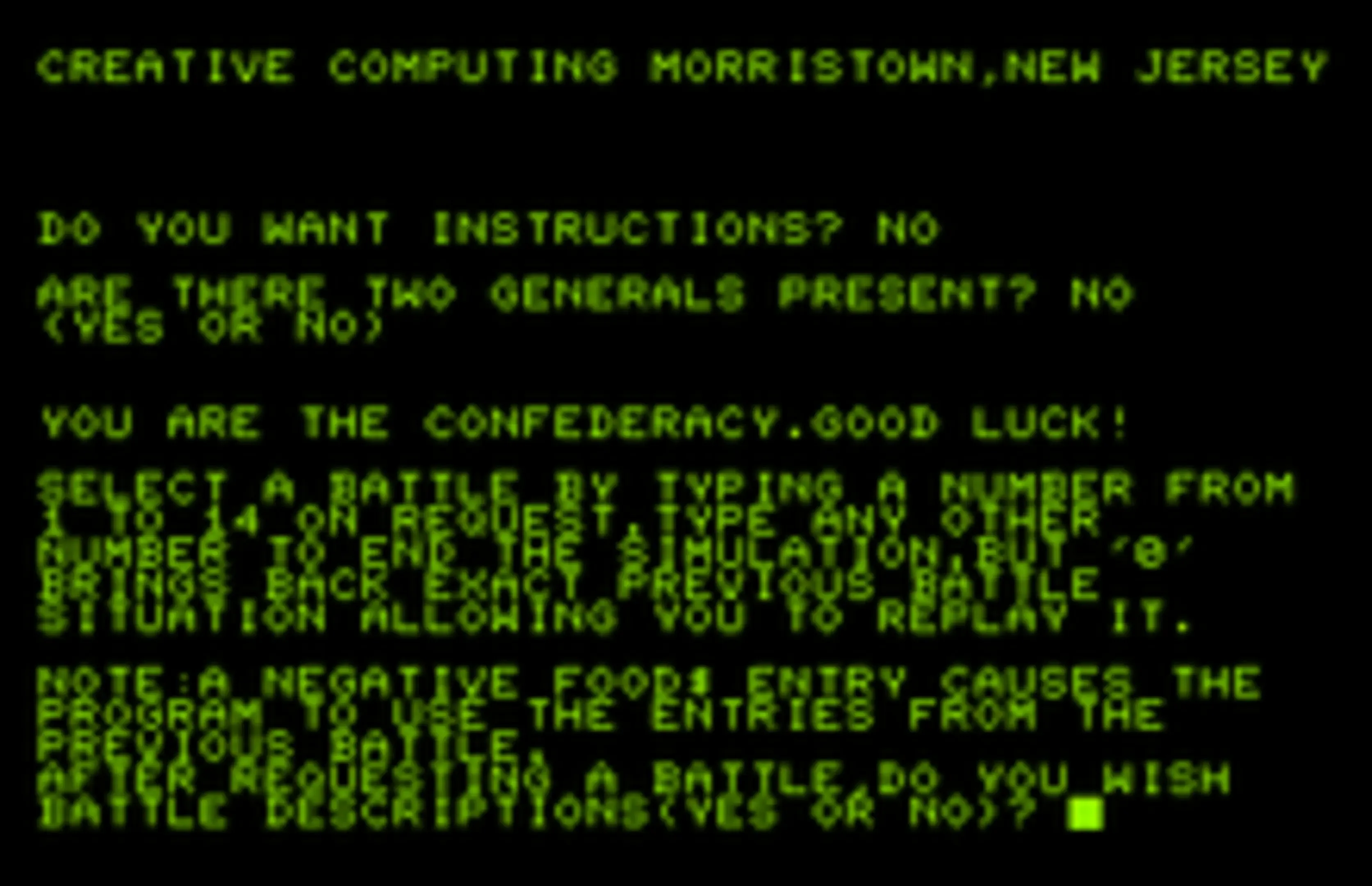 A turn-based, strategic simulation of fourteen real battles of the American Civil War. In single player mode, you play as the Confederacy, while the computer controls the Union. Each turn you have to decide how to allocate your funds on food, ammunition and salaries and choose one out of eight strategies to use in battle (four offensive, four defensive). The sides with fewer casualties wins the battle, and whoever wins eight or more battles wins the war. The game was developed at Lexington High School by students L. Cram, L. Goodie, and D. Hibbard. In 1973, it was compiled and published on "101 BASIC Computer Games" by David H. Ahl, who credited G. Paul and R. Hess of "TIES" for adding a two-player mode