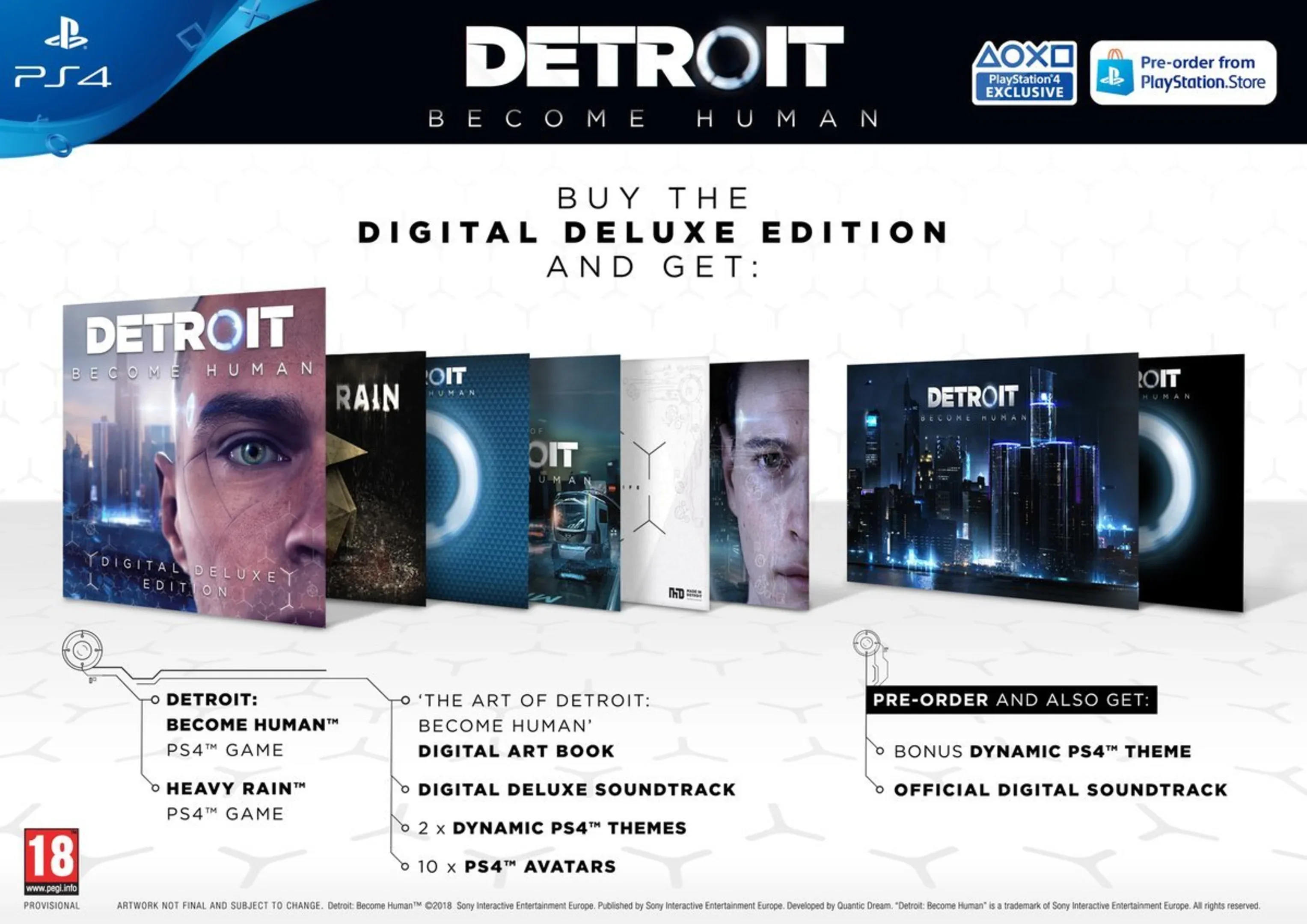 Detroit: Become Human is an interactive narrative adventure game developed by Quantic Dream and released in 2018. Set in a near-future Detroit where androids serve humans, the story follows three android protagonists—Kara, Connor, and Markus—who shape the city’s fate through their choices. Gameplay combines exploration, dialogue interactions, and quick-time events, with branching storylines and multiple endings. The narrative explores themes of artificial intelligence, freedom, and morality. The Premium Edition includes a copy of the game, a limited edition special art book, the original digital soundtrack, the original theme, and a sticker.