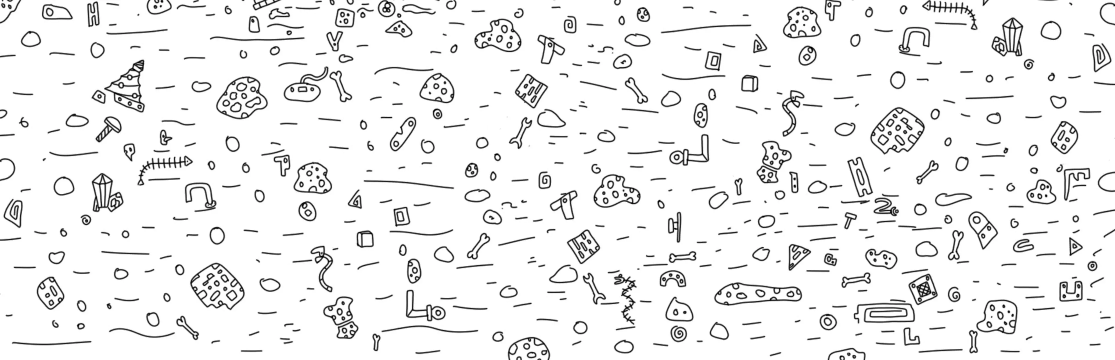 Hidden object game in the alien setting. Black and white hand-drawn graphics in a cartoon style. A large location and cute dogs.