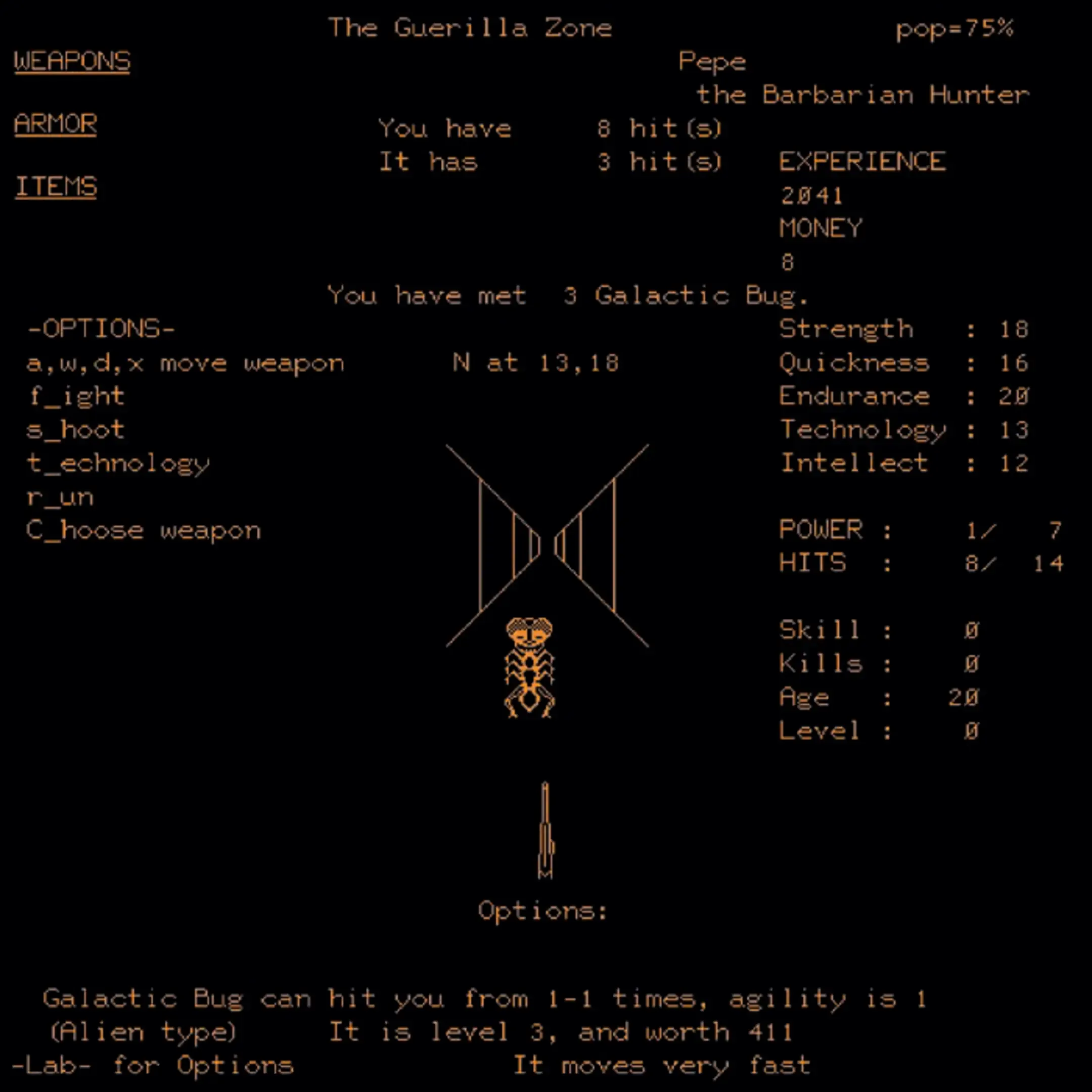 Futurewar is a first person shooter game on the PLATO network. Players walk around in a maze-like first person environment with a gun right in front of them. Monsters can be found in the maze which need to be shot, as well as other players. There are different types of hazardous terrain such as fire, water, and radioactive waste. Elevators allow players to change levels. The bottommost level is called Hell and features the devil himself as a monster.