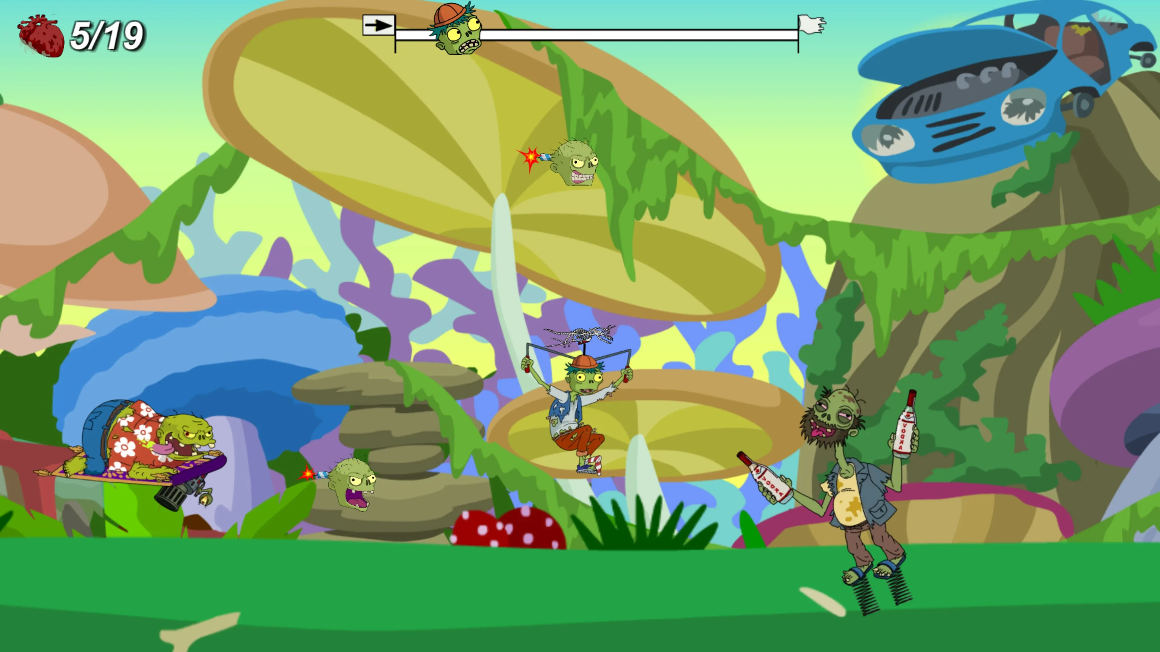 You are a hungry zombie who flies on the dead pterodactyl! Eat brains, bones, liver and heart as much as you can.