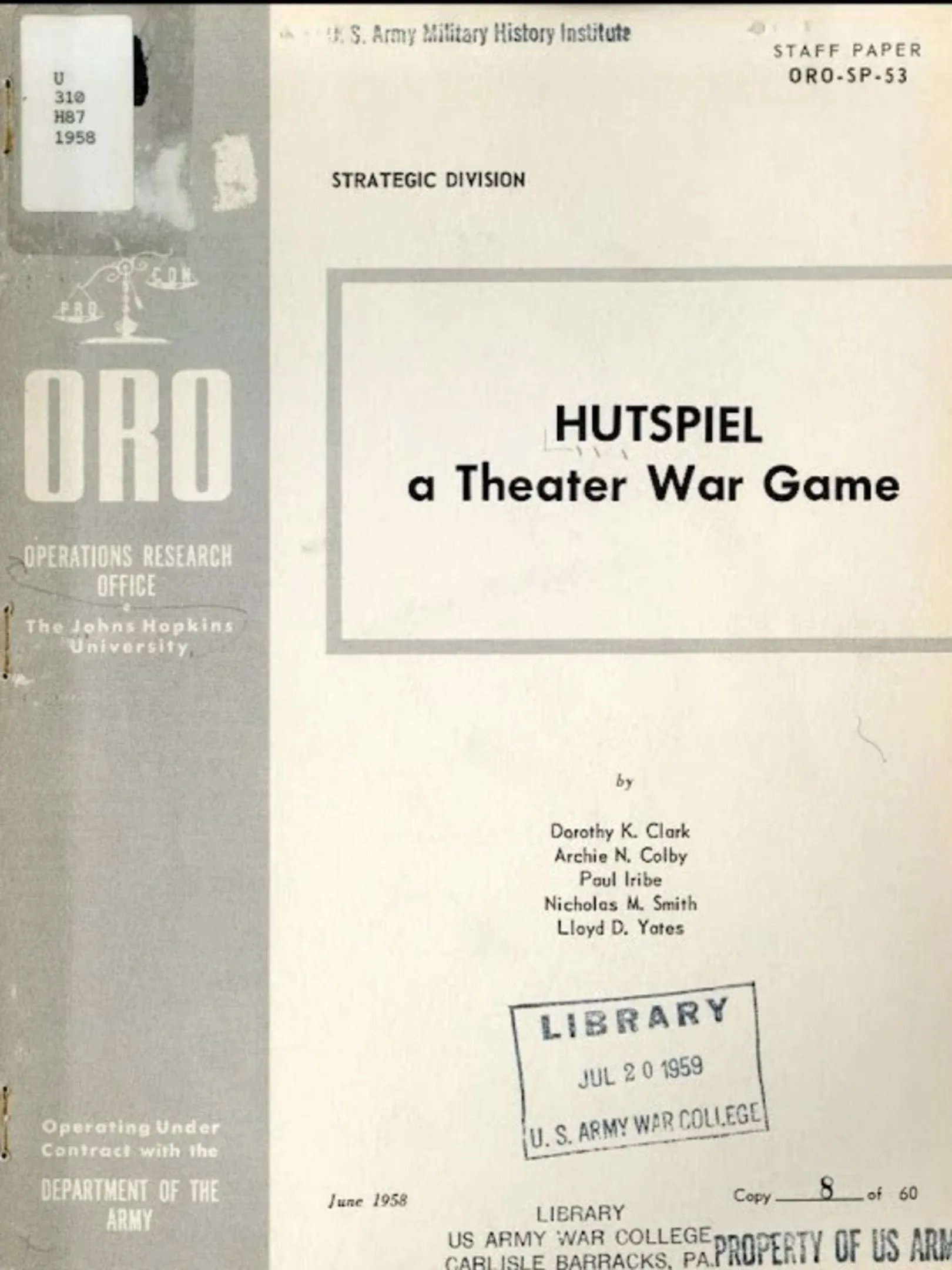 Hutspiel is a military training simulation for the Goodyear Electronic Differential Analyzer (GEDA) that simulates at a theatre level. Its intention was to study the use of tactical nuclear weapons and conventional air support in Western Europe in the event of a Soviet invasion. The game pits two players against each other with one controlling NATO forces in France, Belgium and West Germany, and the other in control of a Soviet invasion force trying to penetrate a 150 mile frontage. Players could allocate forces across sectors of the map and set targets (such as airfields, enemy troops, supply depots and transportation facilities) for planes and nukes. Early versions of the game would have the computer continue the simulation until it was paused for further input. In later versions the game used turns of fixed time increments. The game modeled troop reinforcement, resupply and movement by rail. It did not account for terrain or weather.