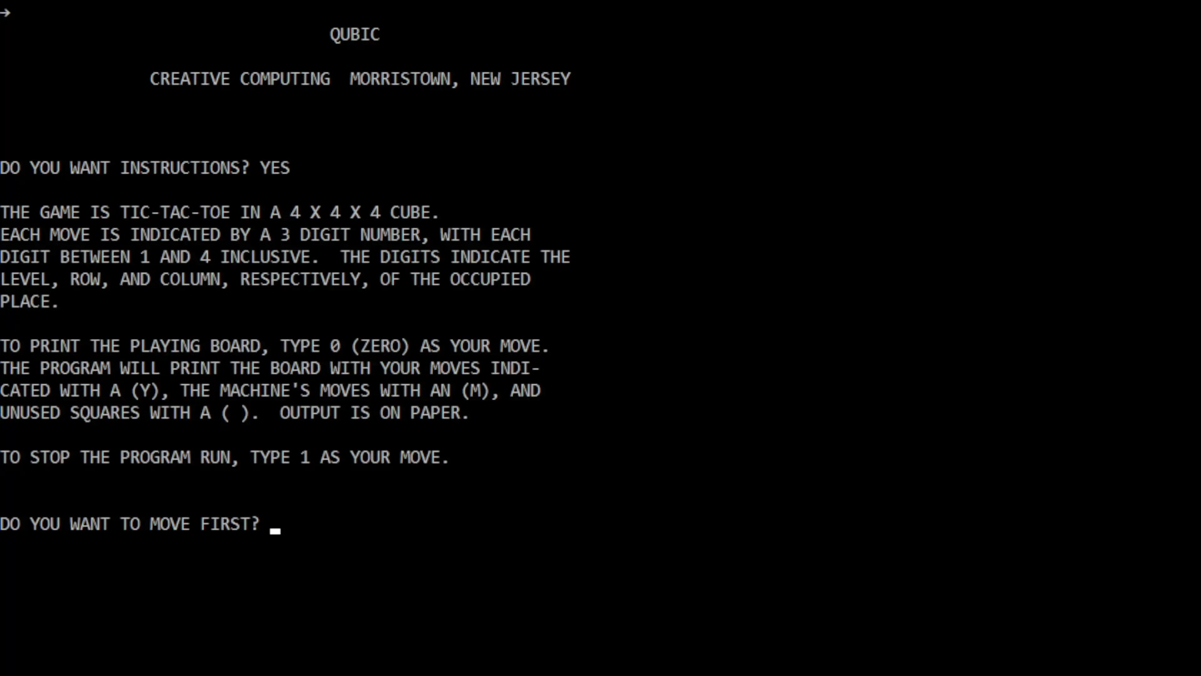 A text-based game of 3D Tic-Tac-Toe against a computer opponent. Originally, the game printed out the game board on teletype paper. It was later updated to include a visual display of the game board.