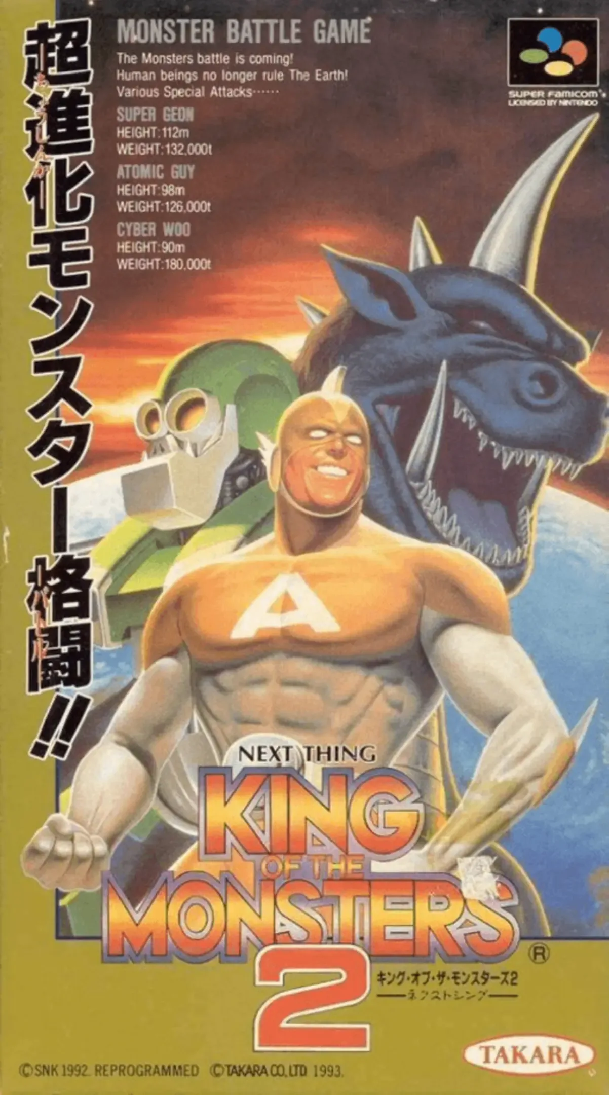 Alien super monsters have returned and are trying to invade Earth again! Now, Super Geon, Atomic Guy, and Cyber Woo must fight to retain control of the planet. Each one has special attacks and powers. Take on monsters that have unique abilities never seen before, including fire breath, aerial spins, and radioactive blasts. Challenge a friend, or have him help you out in the two-player option. Battle your way through seven levels of intense action in King of The Monsters 2.