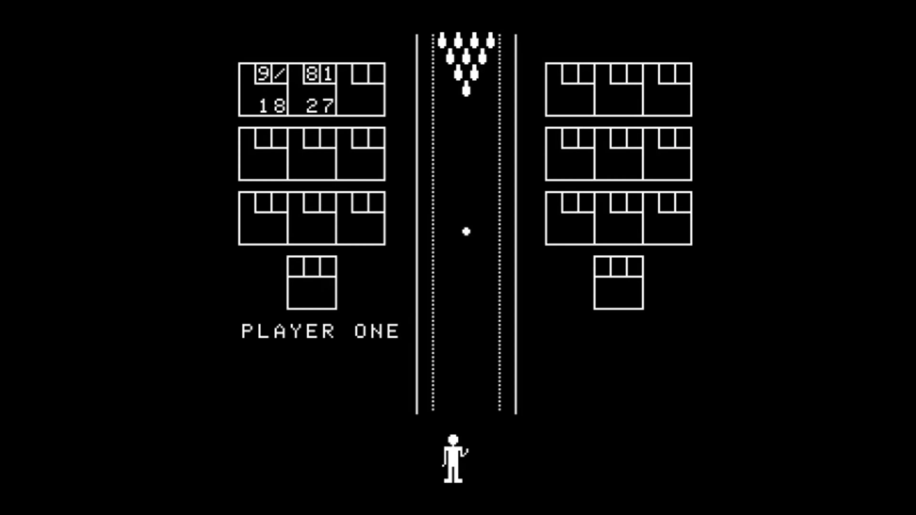 Robot Bowl was a black & white bowling alley game designed and programmed by Edward Valeau and Howell Ivey of Exidy. The game featured one or two robot bowlers playing with the standard bowling rules. To control the outcome, the game had five buttons: left, right, shoot, hook left, and hook right. "Hooking" the ball was the key to getting a good score, as you could only hook the ball after it had been thrown. This made it easy to pick up a spare, but the game made up for it by making splits very common. Robot Bowl was available in two different dedicated cabinets, an upright and a cocktail, both of them used the same internal hardware. The Robot Bowl upright was of the common 1970s 'short cabinet' design, as the machine had no marquee and was only as tall as the monitor. Some machines also had a decorative 'ball return' on the front at the very bottom of the cabinet. There is an interesting story behind that. At the time the game was created, Exidy had just purchased Fun Games and had a number of cabinets left over from one of Fun's driving games. They used these cabinets to get Robot Bowl into production quickly. The only problem was that the cabinets had a hole in the front where the gas pedal had been. Michael Cooper-Hart suggested that they silk-screen the words 'Ball Return' over the hole. The Robot Bowl cocktail was a square box with a perfectly round top. The player controls were on either side of the monitor (and you actually had to look at the game sideways to play). This machine had no decoration of any kind.