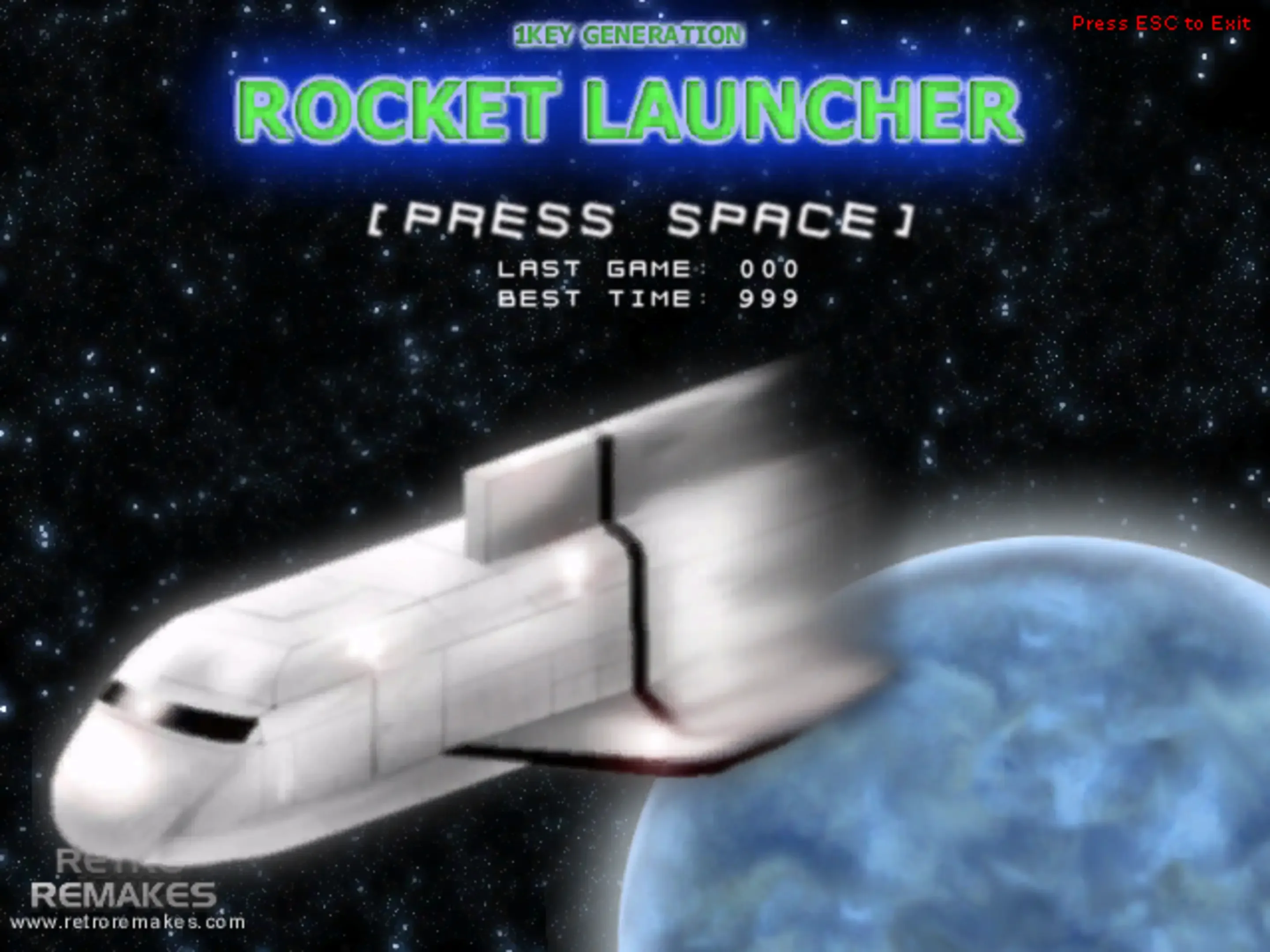 This game is a one-button-game where you have to repeatedly hit the space bar to power up your rocket in order to let it fly into the sky... or crash it nearby. You main goal is to hit the button only then when it is over the green part of your control system. The more you are off the center, the more the rockets angle will increase (if you are still in the power-up area) or the rocket is loosing power (if you are beyond the power-up area). Once you have enough power (turned the vertical red line green), your rocket will start with the angle you have achieved. Depending on that angle, you rocket will either go to the orbit or fly a 180° into the ground. The game has a highscore table that counts the time you needed to get your rocket successfully into space.
